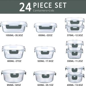 - 24 PIECE FOOD CONTAINER SET: 12 Containers with 12 lids with multiple sizes and shapes to fulfill your storage requirement. Package includes: 1 (35.5 oz). 1 (22 oz) 2 (12.5oz ) 1 (27 oz) 1 (17.6 oz) 2 (11.2 oz) 1 (32 oz) 1 (20.1 oz) 2 (13.5 oz) container with lids