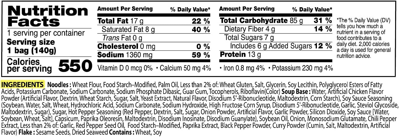 NOODLE(76.7%s: japioca star:ch(12%). palm oil(11%). whe igluth salt. SOYbean oil. water dity regulator(potassium carbon. e(e501). sodium carbcnate(e50c). sodium phosphate dibasic(e339). sodium polyphosphate( for citric acid(e330)].th:ckener [guar gum(e412)]. emulsifier[lecithin(e322]] colour(rip. soup(22.7%): water. artificial chicken flavor powder. white sugar. SOY sauce. red pepper powder. SOYbean oil. onion powder. chilliextract. salt. garlic powder. iapioca starch. yeast extract powder. black pepper powder. curry powder flake(0.6%): roast SESAME roasted laver