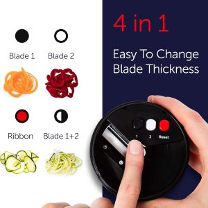 - Functionality with ease – 4 options to fulfil all of your spiralizing needs in 1 space-saving kitchen gadget. Perfect for zoodles. healthy vegetable pastas and gorgeous garnishes and all available with just an easy push of a button.