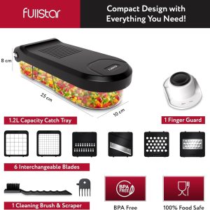 - Great Value & Quality – The Fullstar vegetable chopper is an affordable mandoline slicer and cheese grater that doesn’t compromise on quality. It includes 6 stainless steel blades. 1 cleaning brush. 1 finger guard. and a 1.2L container for safe and efficient meal prepping.